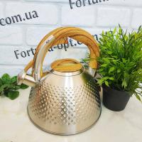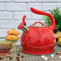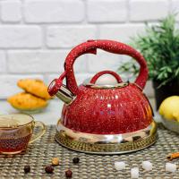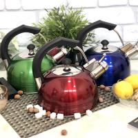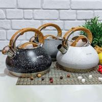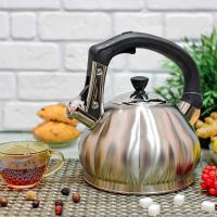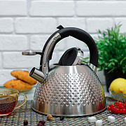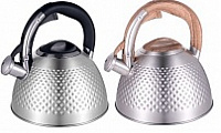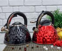 Современный чайник со свистком из нержавеющей стали подходит для всех видов плит. Ручка не нагревается при использовании, так как выполнена из бакелита. Свисток чайника из нержавеющей стали откидывается легким нажатием кнопки на ручке. Стильный дизайн наружной части в виде ромбов, матовая поверхность.