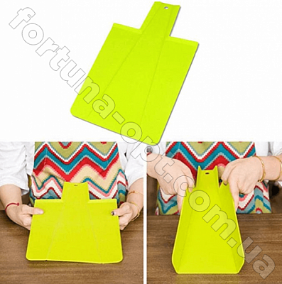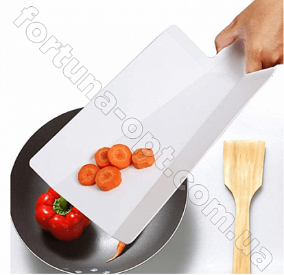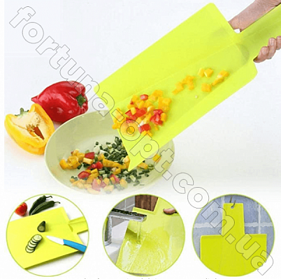 Доска Разделочная складная и гибкая, складывается В "Совок", что позволяет аккуратно перенести нарезанные продукты непосредственно в кастрюлю и любую другую посуду.Ручка рельефная, поэтому вы никогда не будете опасаться того, что доска с продуктом выскользнет из рук. Материал - прочный пищевой пластик яркого цвета. Абсолютно гигиенична, не впитывает посторонние запахи, отлично моется.