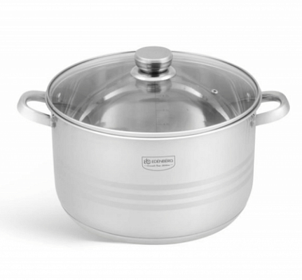 Кастрюля Edenberg EB - 3021 объемом 14,9 л имеет привлекательный дизайн, многослойное термоаккумулирующее дно, благодаря которому тепло внутри кастрюли распределяется равномерно. Конструкция ручек из стали рассчитана таким образом, что они остаются прохладными даже во время продолжительного приготовления пищи. Кастрюля выполнена из нержавеющей стали, которая легка в уходе, а также обладает высокой износоустойчивостью. Подходит для всех источников тепла, включая индукционные плиты. Прозрачная крышка из термостойкого стекла с отверстием для выхода пара. Кастрюлю можно мыть в посудомоечной машине.