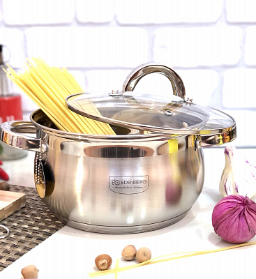 Кастрюля Edenberg EB - 3727 - 6,5 л имеет привлекательный дизайн, многослойное термоаккумулирующее дно, благодаря которому тепло внутри кастрюли распределяется равномерно, что, в свою очередь, препятствует подгоранию пищи. Кастрюля выполнена из нержавеющей стали, которая легка в уходе, а также обладает высокой износоустойчивостью. Подходит для всех источников тепла, включая индукционные плиты. Прозрачная крышка из термостойкого стекла с отверстием для выхода пара. Кастрюлю можно мыть в посудомоечной машине.