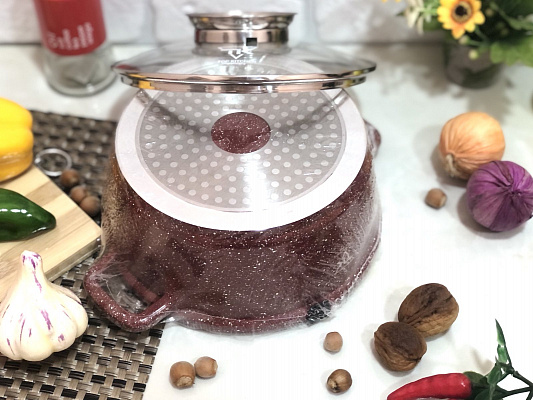 Объем - 2,4 л, изготовлена из высококачественного литого алюминия, имеет современный и безупречный вид, толстые стенки, утолщенное многослойное дно, которое обеспечивает равномерный нагрев по всей поверхности, специальное антипригарное мраморное покрытие. Стеклянная крышка, кнопка с дозатором на ручке крышки, цельнолитые ручки из алюминия. Кастрюля-казан подходит для приготовления на всех современных видах плит. Стильный и практичный дизайн гарантирует качество и функциональность на долгие годы. Идеально подходит для приготовления плова, тушения овощей, мяса и других блюд.