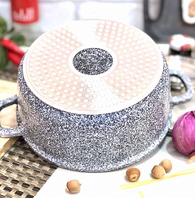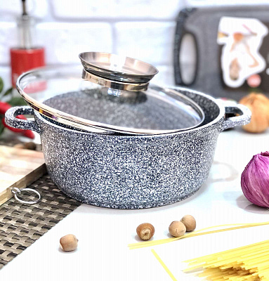 Объем - 2,4 л, изготовлен из высококачественного литого алюминия, имеет современный и безупречный вид, толстые стенки, утолщенное многослойное дно, которое обеспечивает равномерный нагрев по всей поверхности, специальное антипригарное гранитное покрытие. Стеклянная крышка, кнопка с дозатором на ручке крышки, цельнолитые ручки из алюминия, на которые можно легко устанавливать силиконовые ручки. Казан подходит для приготовления на всех современных видах плит. Стильный и практичный дизайн гарантирует качество и функциональность на долгие годы. Идеально подходит для приготовления плова, тушения овощей, мяса и других блюд.