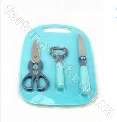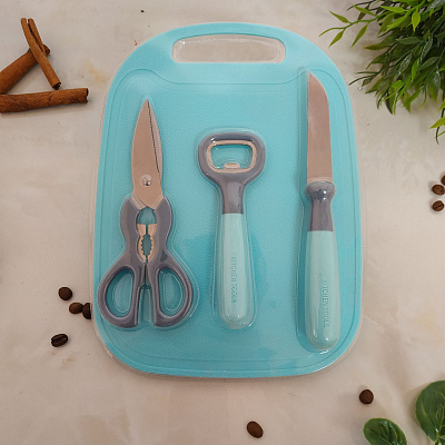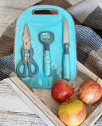 Набор кухонный из 4-х предметов: нож, ножницы, открывалка для бутылок и разделочная доска, будет великолепным приобретением для любой хозяйки. Лезвия из качественной стали отличаются превосходными режущими характеристиками. Практичные рукоятки из специального силикона удобно лежат в руке и не скользят. Легко моется, практичен и удобен в использовании.Можно смело использовать набор в качестве подарка.