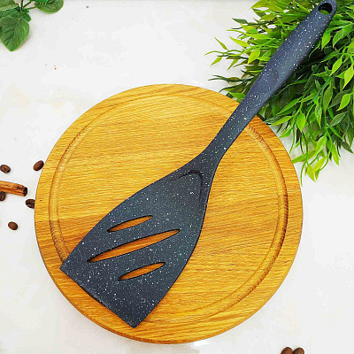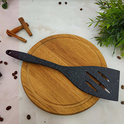 Лопатка с прорезями изготовлена из нейлона. В ручке отверстие для подвешивания лопатки на крючок.
