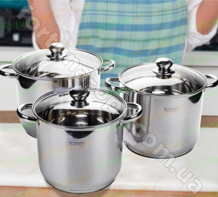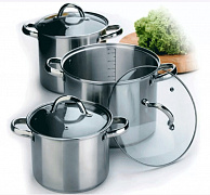 Это качественный набор посуды, благодаря которому Вы сможете приготовить огромное количество пищи качественно и экономно. Набор изготовлен из прочной и высококачественной нержавеющей стали. Этот материал стойкий к коррозии и не влияет на вкус еды. В наборе есть стеклянные крышки с отверстием для выходящего пара. Дно прогревается за считанные минуты и равномерно распределяет тепло по поверхности, поэтому пища готовится быстро и вкусно. Можно использовать на индукционных плитах.