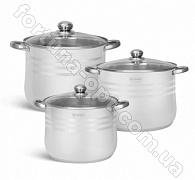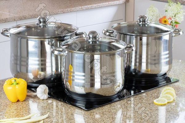 Это качественный набор посуды. Посуда изготовлена из прочной и высококачественной нержавеющей стали. Данный материал стойкий к коррозии, не влияет на вкус еды. В наборе есть крышки, выполненные из стекла, они имеют отверстия для выхода пара. Дно прогревается за считанные минуты и равномерно распределяет тепло по всей поверхности, благодаря чему пища готовится качественно и вкусно. После эксплуатации набор легко очищается от остатков пищи. Посуду можно использовать на индукционных плитах.