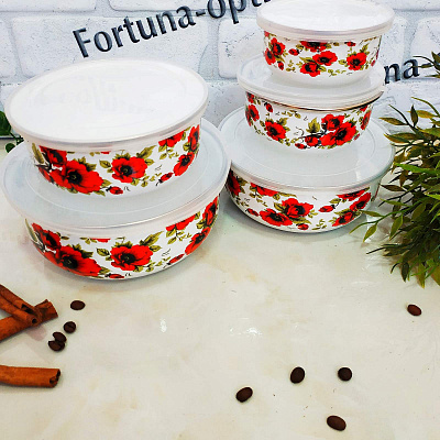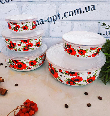 Набор судочков эмалированных (5 шт.) с пластиковыми крышками.
