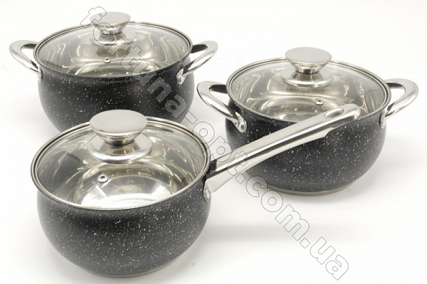 Посуда выполнена из высококачественной нержавеющей стали. Поверхность кастрюль c мраморным покрытием, хорошо защищена от царапин и деформаций. Кастрюли имеют многослойное дно, поэтому Вы сможете быстро приготовить пищу, так как оно равномерно распределит тепло по всей поверхности. На внутренней стороне кастрюль есть мерная шкала, которая подскажет, сколько продуктов нужно поместить вовнутрь. Эргономичные удобные ручки помогут быстро снять посуду с плиты, когда пища будет готова.