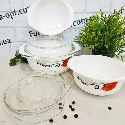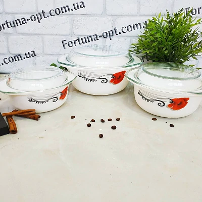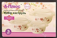 Набор стеклянных кастрюль с крышками 1864 (3 шт) A-Plus. Объем: 1; 1,5; 2,5 л. Изготовлен из закаленного боросиликатного стекла. Поверхность глянцевая, устойчивая к механическим и химическим воздействиям. Не впитывает посторонние запахи. На внешней стороне кастрюли нанесен цветочный орнамент. Крышка изготовлена из прозрачного стекла. Купить наборы кастрюль недорого вы можете у нас на сайте: fortuna-opt.com.ua