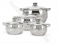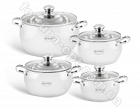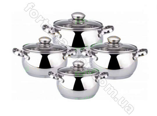 Данный набор посуды 1115 включает в себя 4 кастрюли разного размера. Для каждого изделия есть стеклянная крышка. Набор подходит для всех видов плит. Посуда выполнена из высококачественной и безопасной для здоровья нержавеющей стали, которая отличается прочностью. Изделия прослужит Вам долго и эффективно, так как корпус имеет хорошую защиту от деформаций и повреждений.