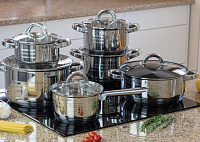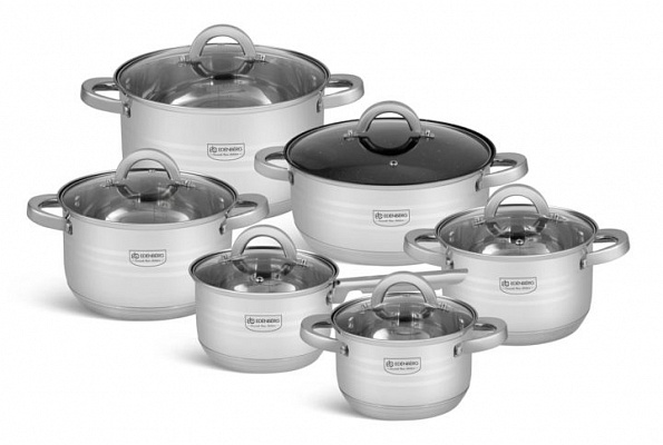 Набор посуды Edenberg EB - 4013 имеет привлекательный и стильный дизайн, многослойное термоаккумулирующее дно, которое, в свою очередь, препятствует подгоранию пищи. Набор выполнен из нержавеющей стали, что легка в уходе и обладает высокой износоустойчивостью. Подходит для всех источников тепла, включая индукционные плиты. Прозрачные крышки изготовлены из термостойкого стекла с отверстием для выхода пара.
