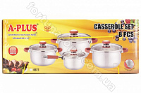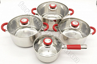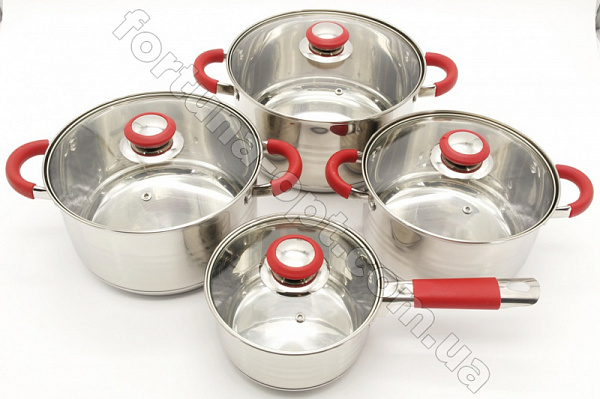Набор состоит из 8 предметов - 3 кастрюли и ковш со стеклянными крышками. Набор выполнен из высококачественной нержавеющей стали. Ручки удобные, не нагревающиеся, с силиконовым покрытием. Благодаря утолщенному семислойному дну тепло распределяется по всей поверхности кастрюли и ковша, что обеспечивает быстрый нагрев. Крышки из жаропрочного стекла с отверстием для выхода пара. Легко моется и чистится. Не ржавеет, является экологически чистой посудой. Стильный дизайн и красивый внешний вид. Не подвергается коррозии и потускнению. Прослужит Вам долго и качественно!