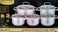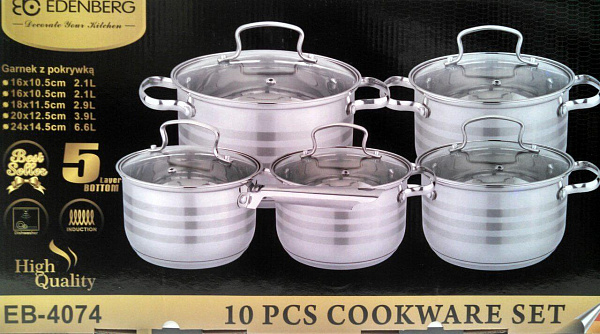 Набор посуды включает в себя четыре кастрюли разного размера с крышками и ковш. Посуда изготовлена из прочной высококлассной нержавеющей стали, которая не поддаётся коррозии и имеет хорошую защиту от царапин и деформаций. Данный материал безопасен для здоровья, так как является экологически чистым. Пятислойное дно прогревается равномерно и быстро, благодаря чему пища будет готовиться качественно и вкусно. Посуда из набора совместима с индукционными плитами.