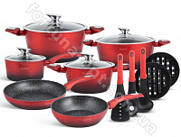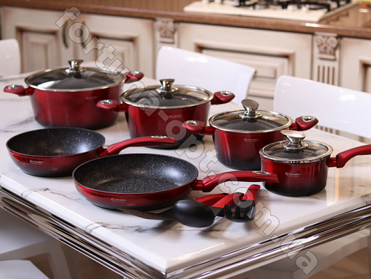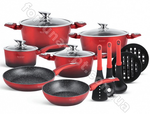 Набор посуды Edenberg EB - 5619 состоит из 15 предметов - ковша, трех кастрюль, 2 сковороды, набора кухонных принадлежностей, 2 бакелитовых подставки. Также в комплект входят стеклянные закаленные крышки с отверстием для выхода пара. На крышках есть ободок из нержавеющей стали, что придает набору современный вид. Посуда изготовлена из высококачественного алюминия с пятислойным мраморным покрытием.
