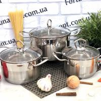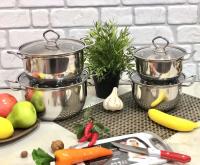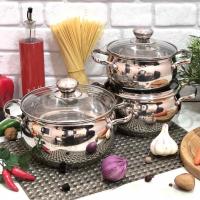 Данный набор посуды включает в себя три кастрюли разного размера и крышки для них. Изделия сделаны из безопасной для здоровья и прочной нержавеющей стали, которая отвечает всем мировым требованиям качества. Трехслойное капсульное дно прогревается за считанные минуты, равномерно распределяя тепло, благодаря чему пища готовится качественно. Нержавеющие ручки помогут быстро снять посуду с огня. После эксплуатации кастрюли легко очищаются под горячей водой. Также их можно отправить в посудомоечную машину.