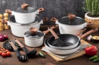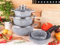 Набор состоит из 3-х кастрюль, 2 сковородок, ковшика с внешним и антипригарным покрытием из гранита. Также в наборе 2 подставки под горячую посуду и прихватки из силикона для казанов. Набор посуды имеет стеклянные крышки с дозатором для масла, благодаря чему можно постоянно заливать масло в держатель во время приготовления или тушения. Посуда Edenberg EB - 8040 имеет индукционное дно, что делает ее современной.