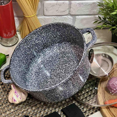 - Изготовлен из высококачественного алюминия, имеет антипригарное мраморное покрытие, толстые стенки.